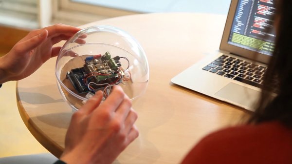 Moti is a robotic ball that is sensitive to its environment, moves on its own, and changes colours to emote feelings; specifically designed for children with special needs. All of its hardware and software is open souce and available on Github. Moti is made with Arduino and uses a bluetooth module to transfer data of the child's interaction with it to a server, where it gets analysed. The behaviour of the robot is then adjusted according to the child's needs. The Moti ball is quite large, about 20 cm in diameter, also - I'm guessing' to accomodate the wheels and motors that make it move around. here.