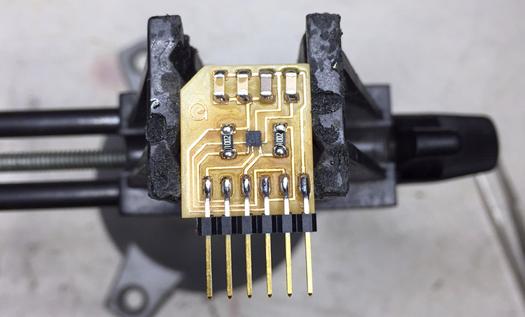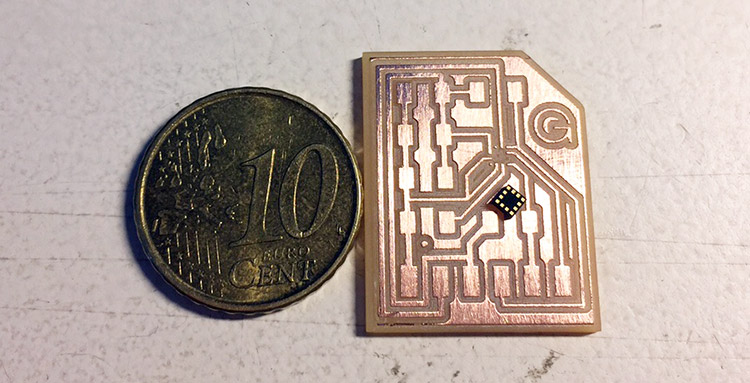 Milling this board was quite hard as well, since I’m using some routes with 0.254mm, in order to connect the LSM303C accelerometer, the 1/64” milling bit is too big. So first I tried with a ‘’half broken’’ 0.1” bit that still works to cut, for example, pads for ATMEGA 328, but since it was not sharp enough the result was terrible and some of the accelerometer traces gone during the process: