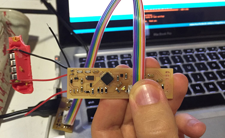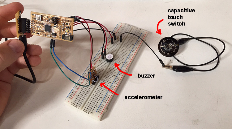 Now everything working, so I just uploaded the code using Arduino IDE. And then I made some changes and added some filters in the code to calibrate the capacitive sensor and the accelerometer. You can download it in the end of this page. Is important to say that this board doesn’t have a power supply connection from FTDI, so to program it you must power it, I’m using a 6V battery, in this case.