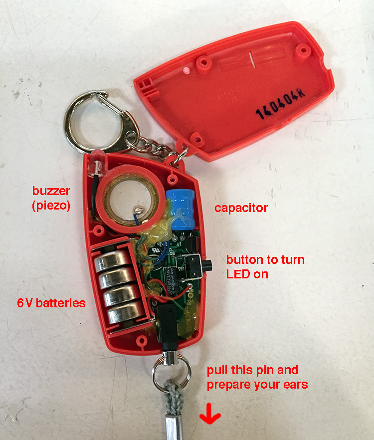 After teardown it I realize two things, first this is made basically with an oscillator, two big capacitors in order the get a higher voltage using only 6V batteries and a piezo to make noise. The second thing I realized after break the buzzer closure and remove the piezo. I barely could hear the noise without the plastic case. So the secret to have a loud noise with a piezo is the closure design because it works with a kind of resonance, and so after some google research I decided to buy a new alarm and this time keep the piezo closure save. Probably I could try to reproduce this design and 3D print it but since I didn’t have time the best choice to get a louder result is use this.