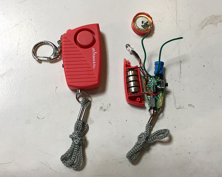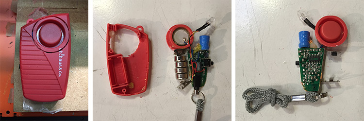 Next step was the alarm, so I found in a local store a pull pin alarm, witch is a very loud compact and portable alarm, and I bought it because I was curious to see how it works and to decide if I should reproduce it or just hack and use it.
