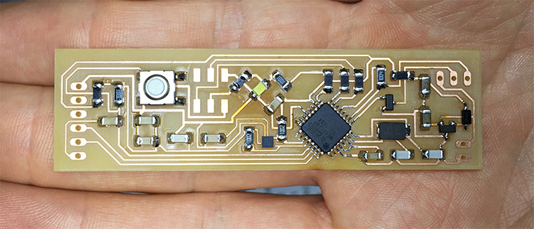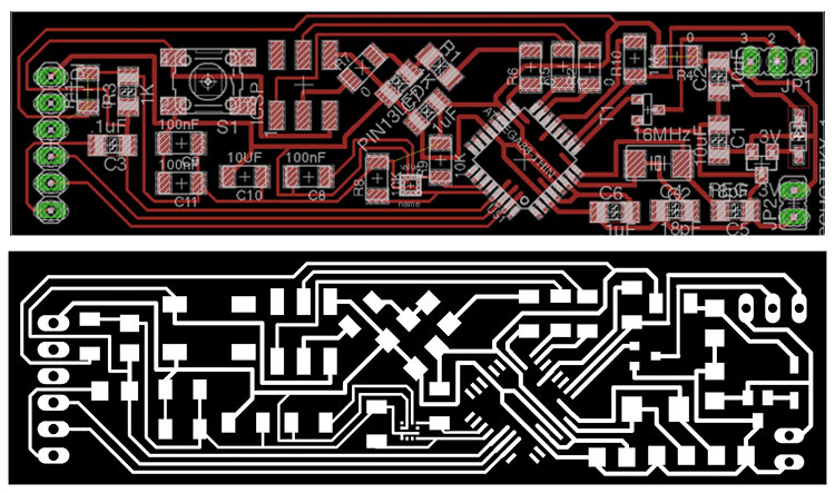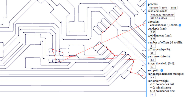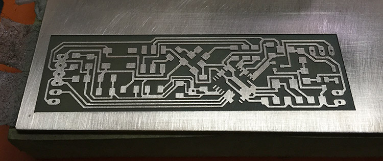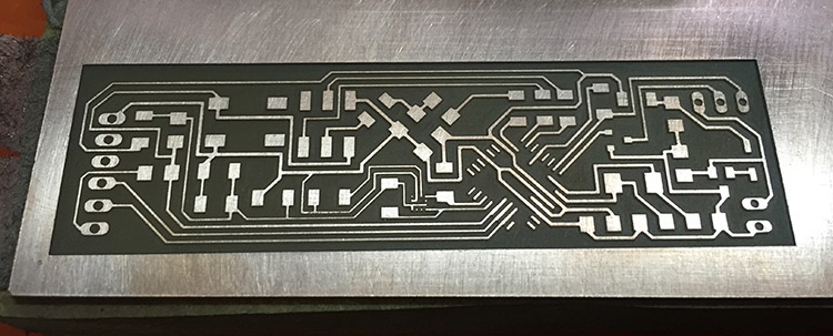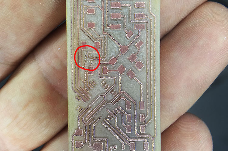 • Mill the rough part using 1/64’’ bit and “PCB traces (1/64)” settings from fabmodules and -1 offset to keep only the traces, and since the tool diameter is bigger than some traces it wouldn’t cut the smaller parts;