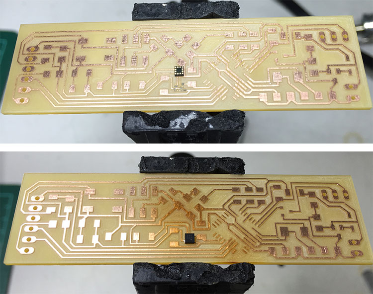 After milling I started soldering by the accelerometer. Since it has 2mm2 and 12 pins underneath I decided to use solder paste to do it. My method was first use a needle to spread the paste over each pin and then drop the component in the right position. Then use heat gun to melt the paste and solder the component.