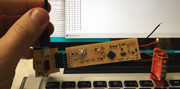 So next challenge is make a capacitive touch sensor to turn it on and off with a code sequence of touch. I found an example of knock knock locker using arduino + piezo, so I will try to use this with my capacitive sensor instead of a piezo. By now I’m using a Barduino and the accelerometer as a shield, just to program everything, once I finish the programming I will design a board with everything included and with the right size to fit inside of a steerer tube. This is how my board setup for programming looks like: