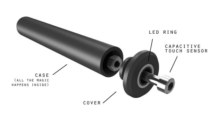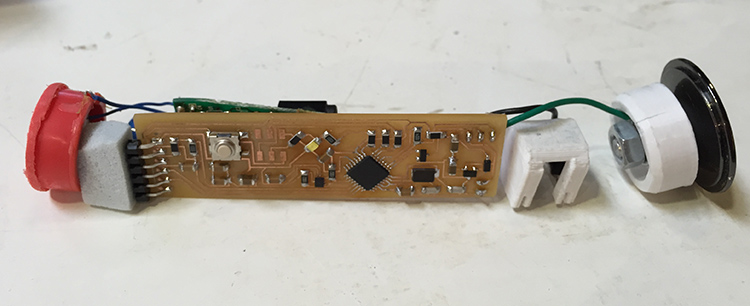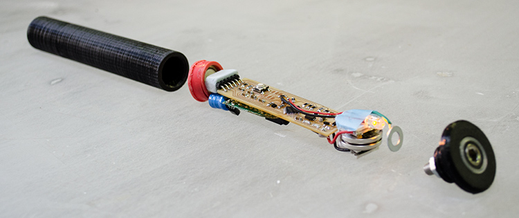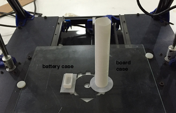 The result was good, but a few layers came out bad and at the end it broke. Also my board didn’t fit inside, so I ended up presenting my project without a case. Just some parts 3D printed to hold the batteries and to have a cover. (I’d been trying to find a PVC or steel tube to buy and use as a case but unfortunately here in Barcelona they have some dimensions standards, and so I was looking for 24mm outer diameter but they only have 20,22 or 25mm). So this is how I presented: