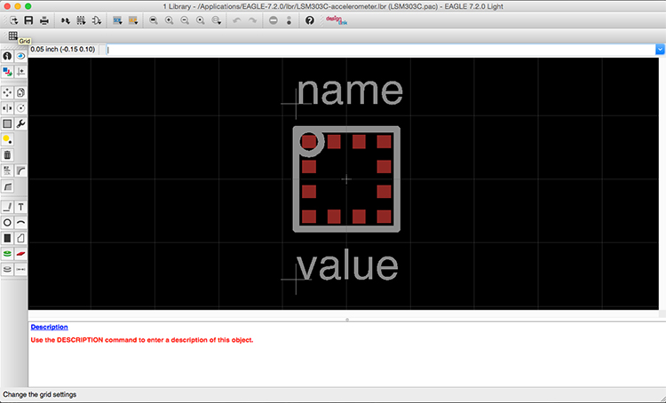 Also as I couldn’t found an eagle footprint for the LSM303C accelerometer I created a new library component following the dimensions of data sheet, and the instructions of this tutorial.