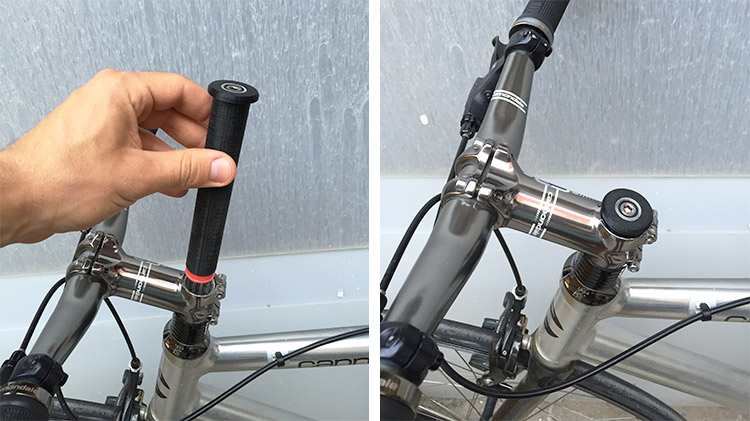 It’s easy, every bike that has the threadless headset, (what is the difference between threaded and threadless?), has a free space inside of the steerer tube, witch is the steel tube that connects your fork with your handlebar. And so, the only thing that is inside of this tube is a star nut but you can push it down a bit to open space for the alarm. And afterwards, you can just use a bigger screw. So, let’s do it: (I bought a M6 x 170mm socket cap screw to push it down)