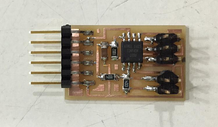 We couldn’t buy the SMD 2D accelerometer because the minimum order is something about 1.000 thousand pieces. So we order the ADXL335 accelerometer board. Then I changed the Neil’s hello.accell.45 design to add one more axis as the ADXL335 has 3 axis, and also I added a connector to put the accelerometer board. This is how my board looks like: