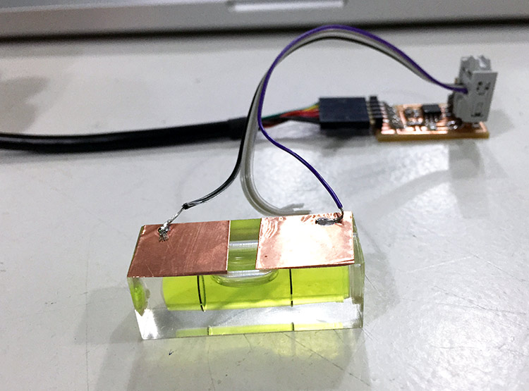 I finished my board but the accelerometer was not delivered yet, so I decided to try to use the step response board because at the end what I want is something to measure the bike movement, and I would like to try with the hello.txrx.45 plus something liquid. So I made these board and bought a level tool on chinese shop for 3,50 euros with 3 bubble level capsules.