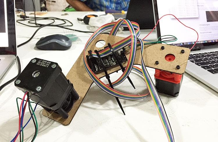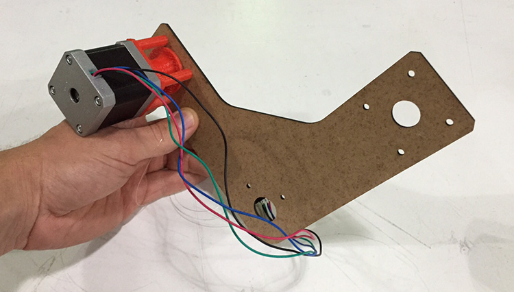 After modeling in SolidWorks we made the first prototype laser cutting the frame and printing the other parts. We are using the Nema 17 and for this first try arduino + driver to control, made by Gabriela Gardosi.