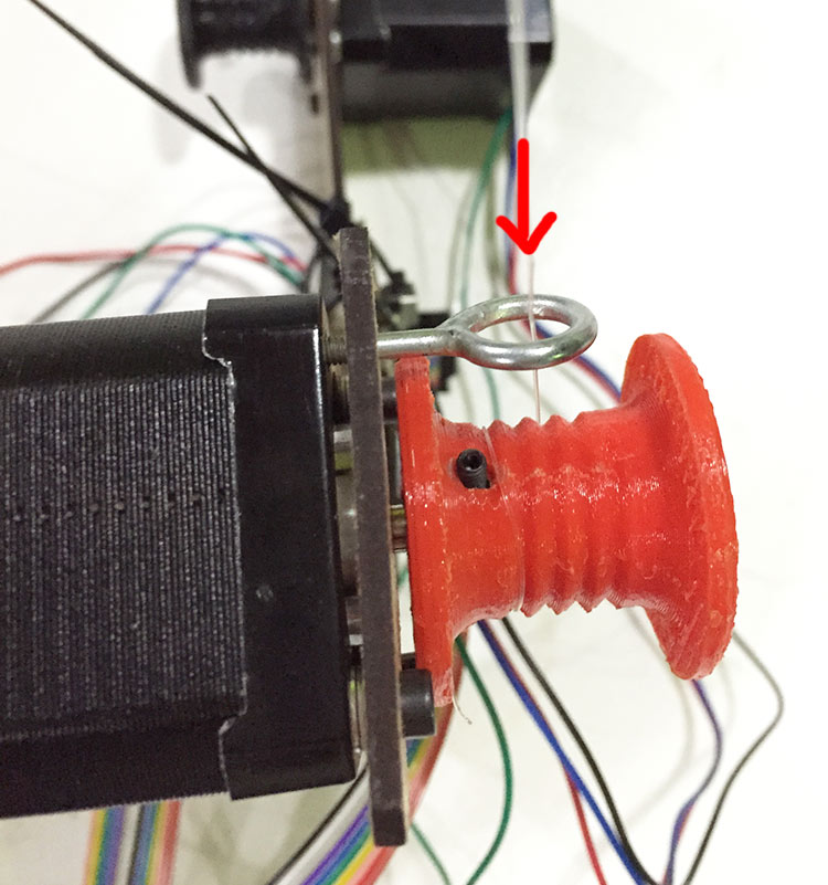 But it was still unbalanced, and so what we did was put the motors a bit more close of the machine body. Also we removed the 3D printed cage because the cables weren’t passing smoothly through it, and in order to keep the cables rolling without get off the rolls we attached a hook in one of the motors holes, and so it could give direction to the fishing line.