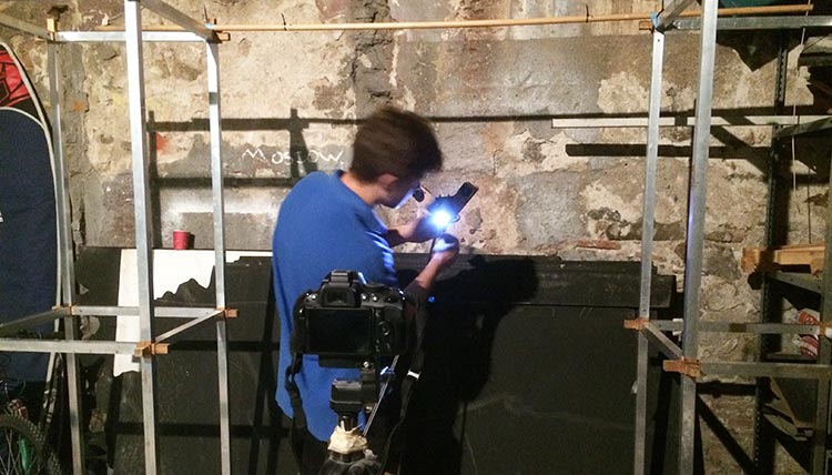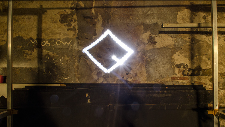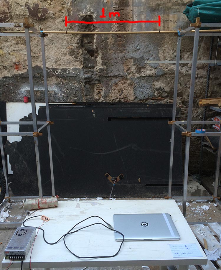 Time to programming it and make it light painting! We moved to outside to have more space and hang the machine in a metal structure that was there. So we made two holes, 1m distance between, in a wood stick in order to tight the machine there.