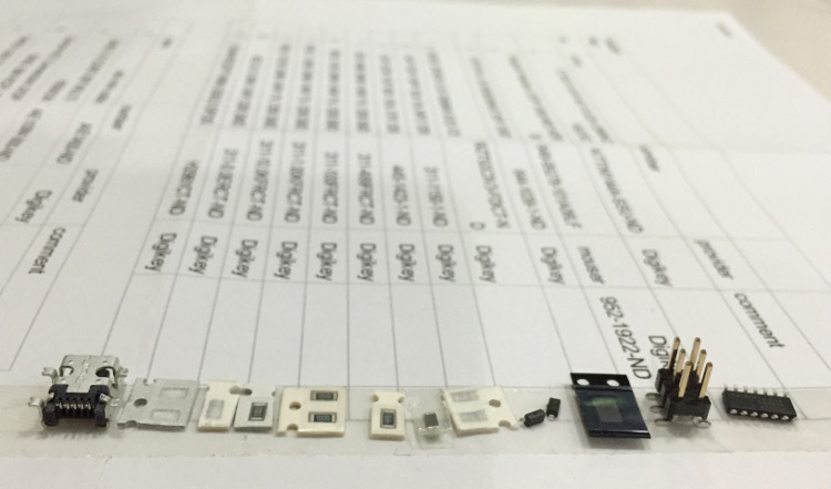 The first step was to separate all the components. To make sure that I wouldn't mix everything I used a double sided tape beside the components list: