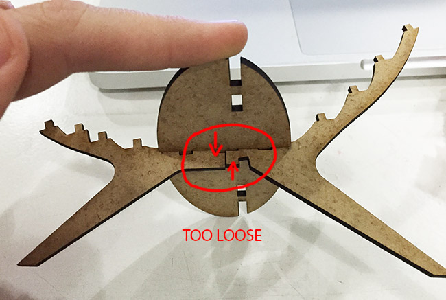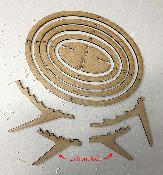FAIL: I made some mistakes in the first cut. First I cutted two front feet and one side feet. Second I didn’t measure the sheet thickness and it has 2,6mm instead 3,0mm so the joints were loose. Besides, I realize that the feet will need more joints between itself to become more stable.