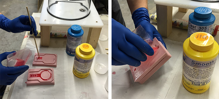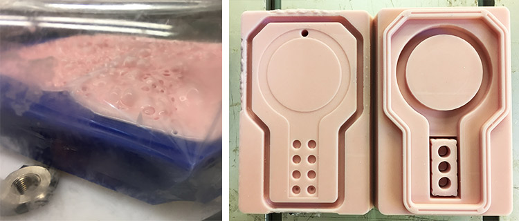 For the two parts mold I made the silicone casting with food safe material so I can make chocolate Lego. We have a vacuum chamber that makes everything easier with the bubbles problems. So, I used it a lot of times before cast and after cast, first vacuum only the mix after mixing, then I putted a thin layer of silicone on top of the mold surface and vacuum it again a few times, and finally after cast all the material I putted the mold on the vacuum chamber for a few more times.