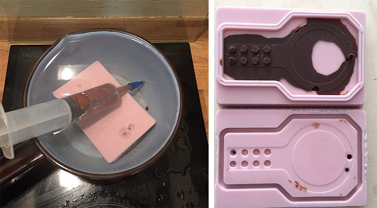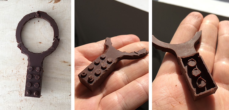 The Lego chocolate pieces as well. Ferdi taught me a nice and very clean technic to cast chocolate using a syringe. It’s very simple, just take a big syringe and put the chocolate pieces inside, close the tip and put it in boiled water, wait until the chocolate get’s melted and cast it! And after cast you can just put the syringe with leftover chocolate in the fridge to reuse it