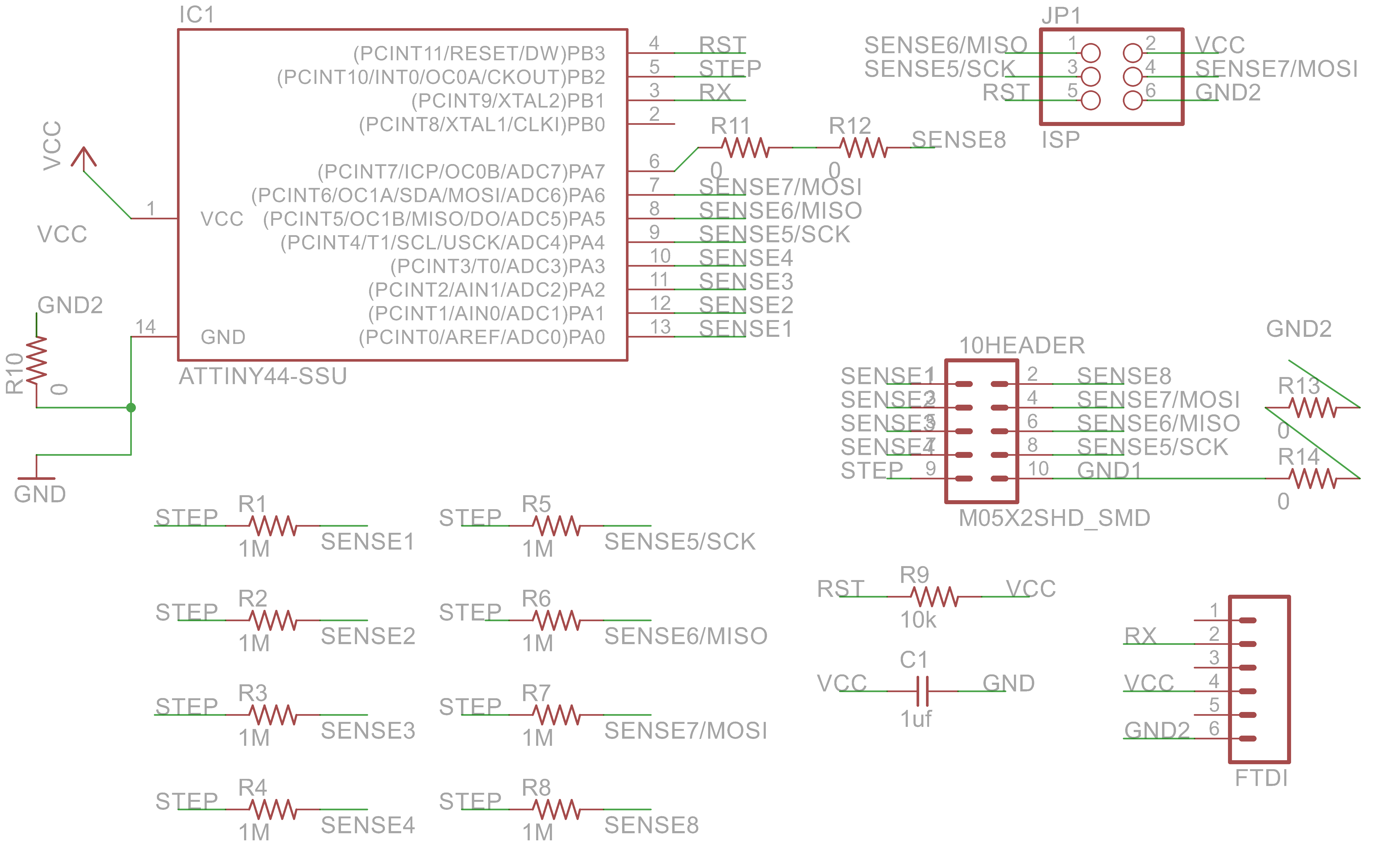 The output you see on the screen is a value between 0 and 80. Left is 0, right 80 and as my finger slides along the pads, the value changes. When you touch two adjacent pads, it is shown in the output on the screen. For example, if pad 3 gives as output 30 and pad 4 give 40, the output when you touch pad 3 and 4 is 35.