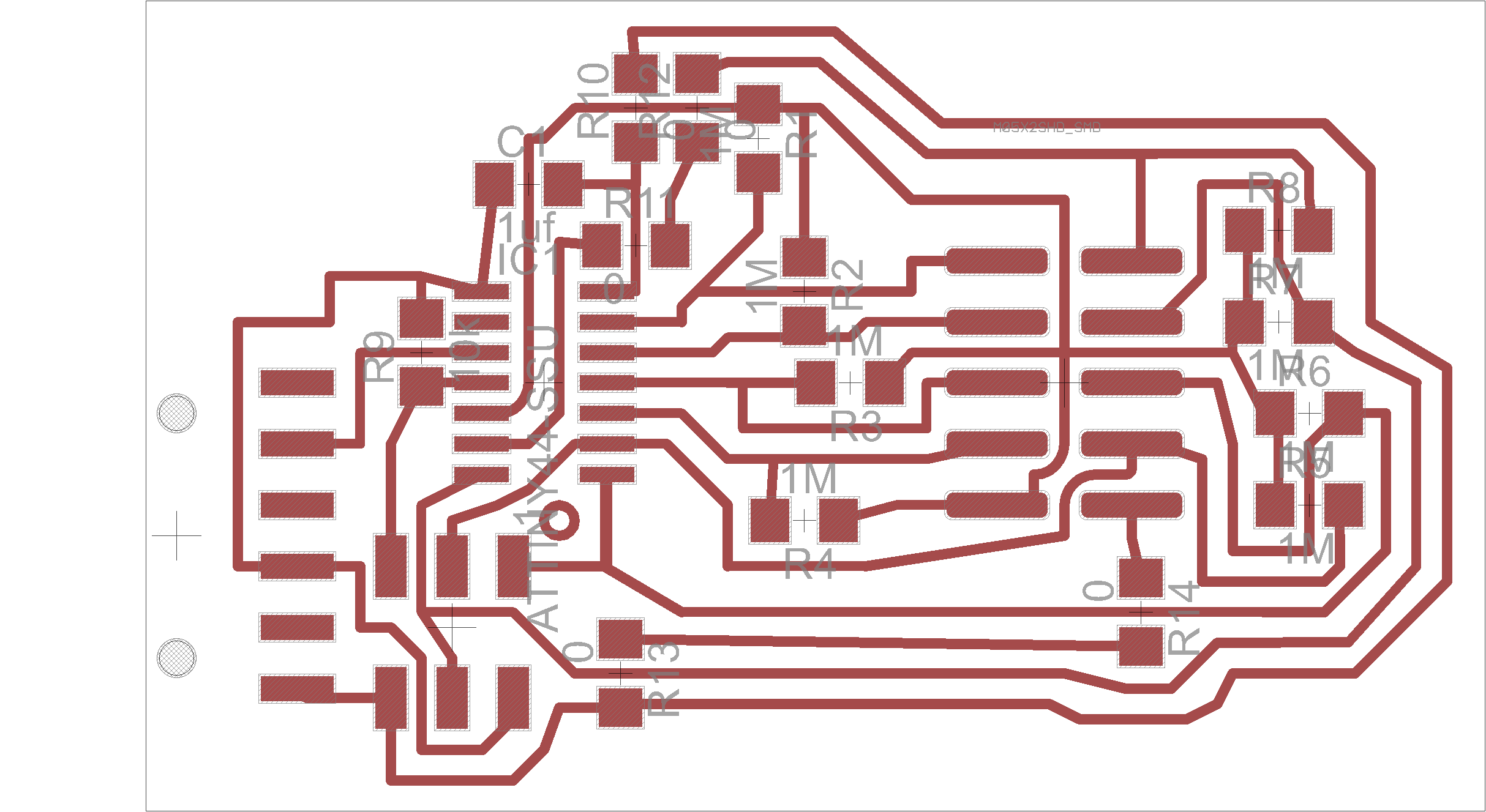 I did some research on earlier Fab Academy/How to make (almost) anything assignments during the input week and found a few good examples. I based my board design on the work of Akash Badshah. I've redrawn the board from scratch in Eagle, because I never did this and wanted to see how it works. I didn't want te copper touch pads to be on the board. Instead I used to vinyl cutter to make the copper pad. To be able to connect the copper pads to the board and easily change between different layouts, I added a 10 pin header.