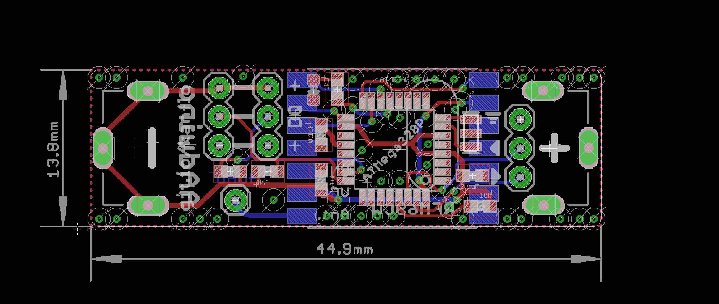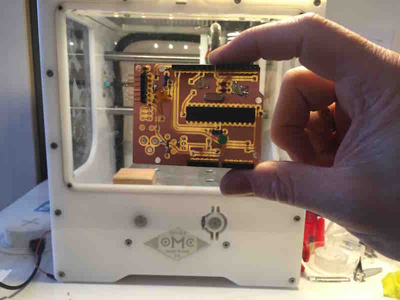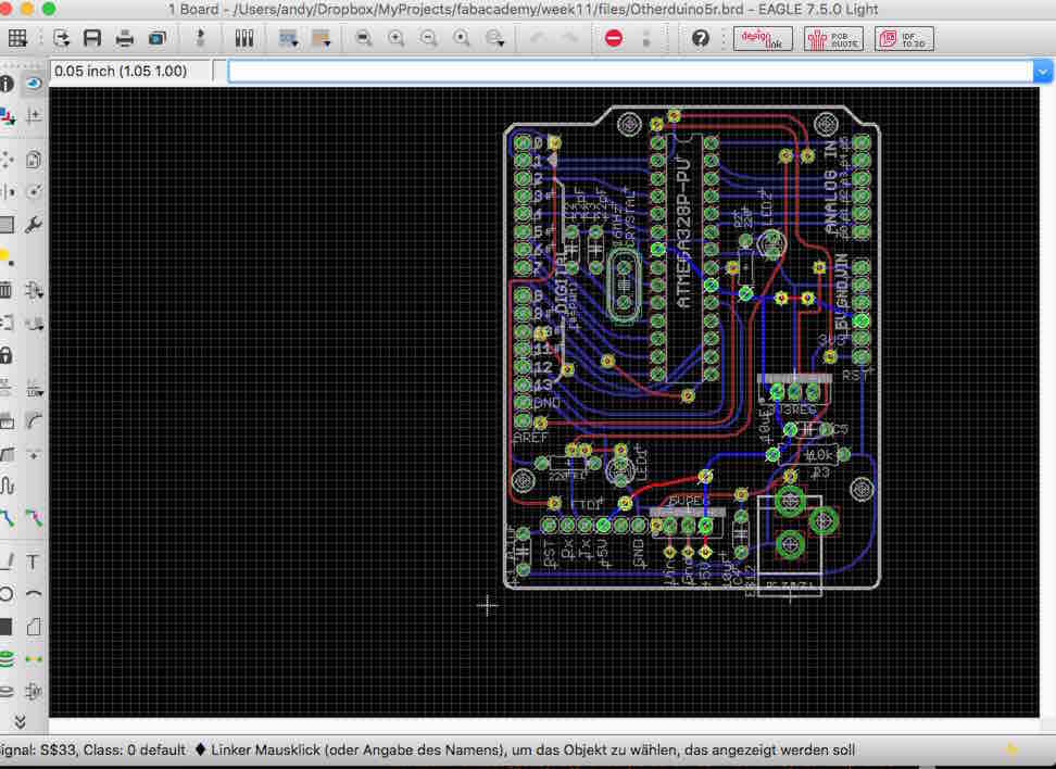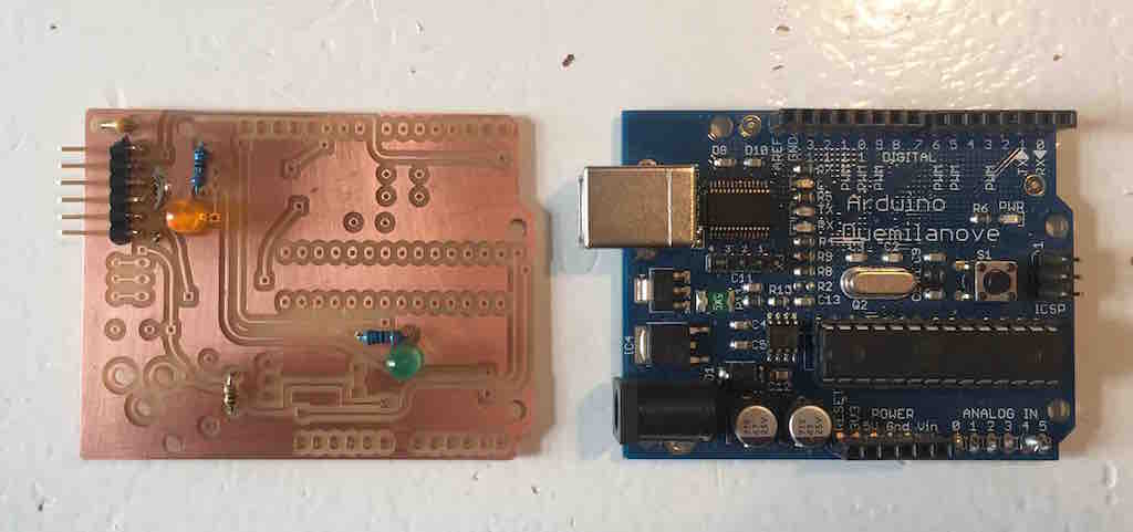 Now I got a 2 sided FR2 and I tried to cut the Arduino again. It cut beatfifully with the Othermill I just had to postprocess a little. The machine is great it tells you when to change tool and you can easily produce two sided PCBs
