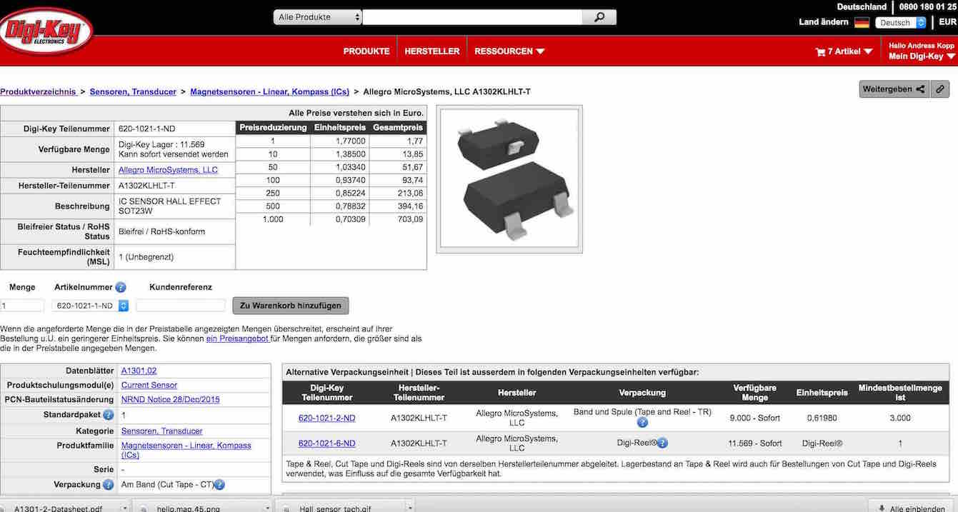 First I looked in the Fab Academy Inventory for the parts number of the Hall Sensor called A1301 from Allegro with the Part Number 620-1021-1-ND and then I looked on the Digikey website for the datasheet. If you would order it from Digikey Germany a sensor would be 1,77€ when you buy ten the cost would be 1,38€.