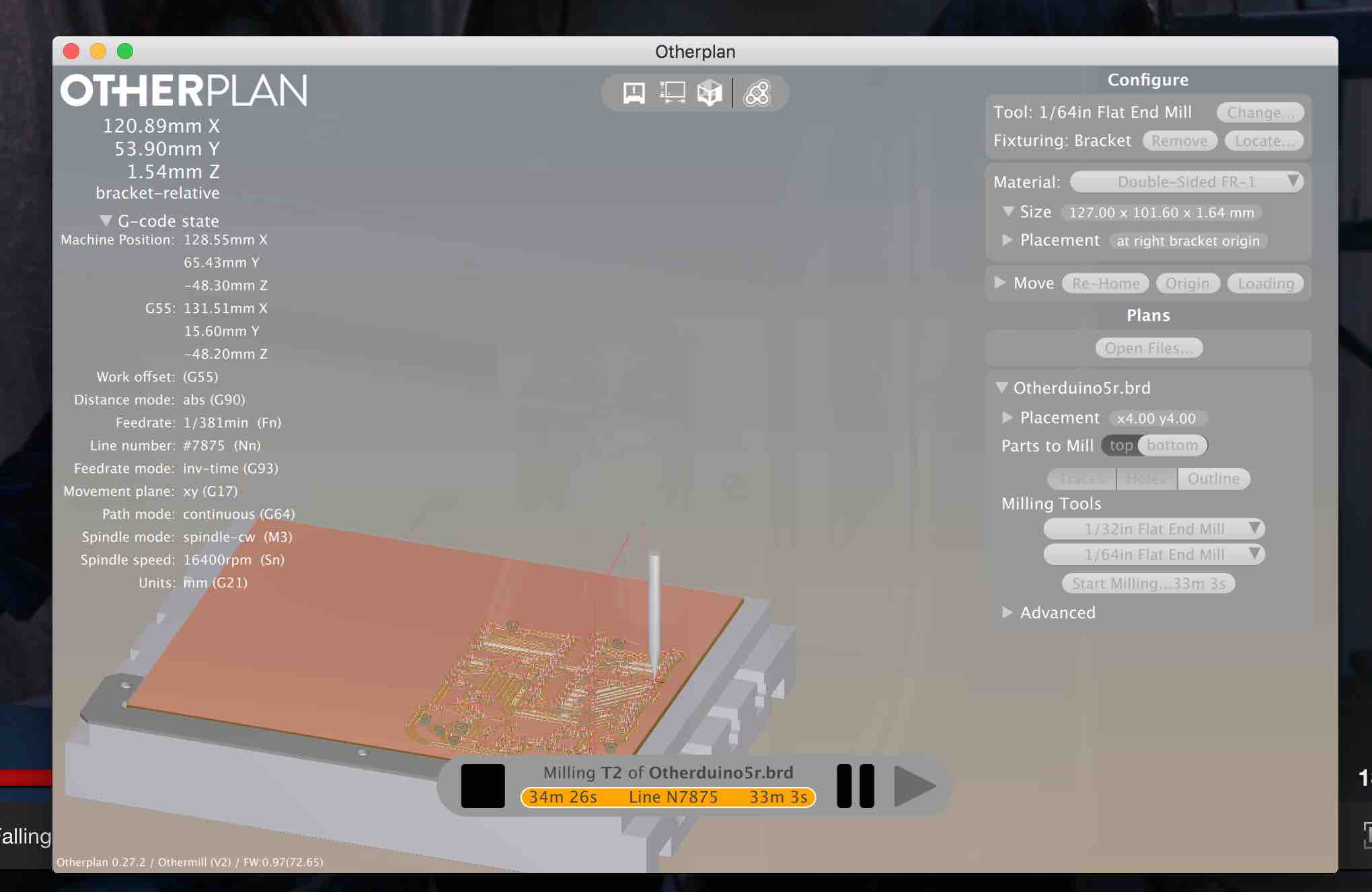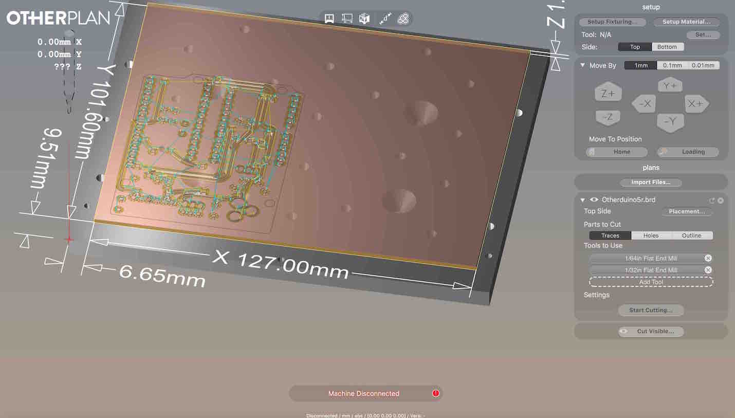 I already tried to cut the Otherduino as a second project with my new othermill but I used only a once sided FR2 board and the design was two sided. I only used the mill for two cuts but the otherplan software is great. You can directly use the brd files from Eagle and do not have to prepare traces and outline images in gimp or photoshop.
