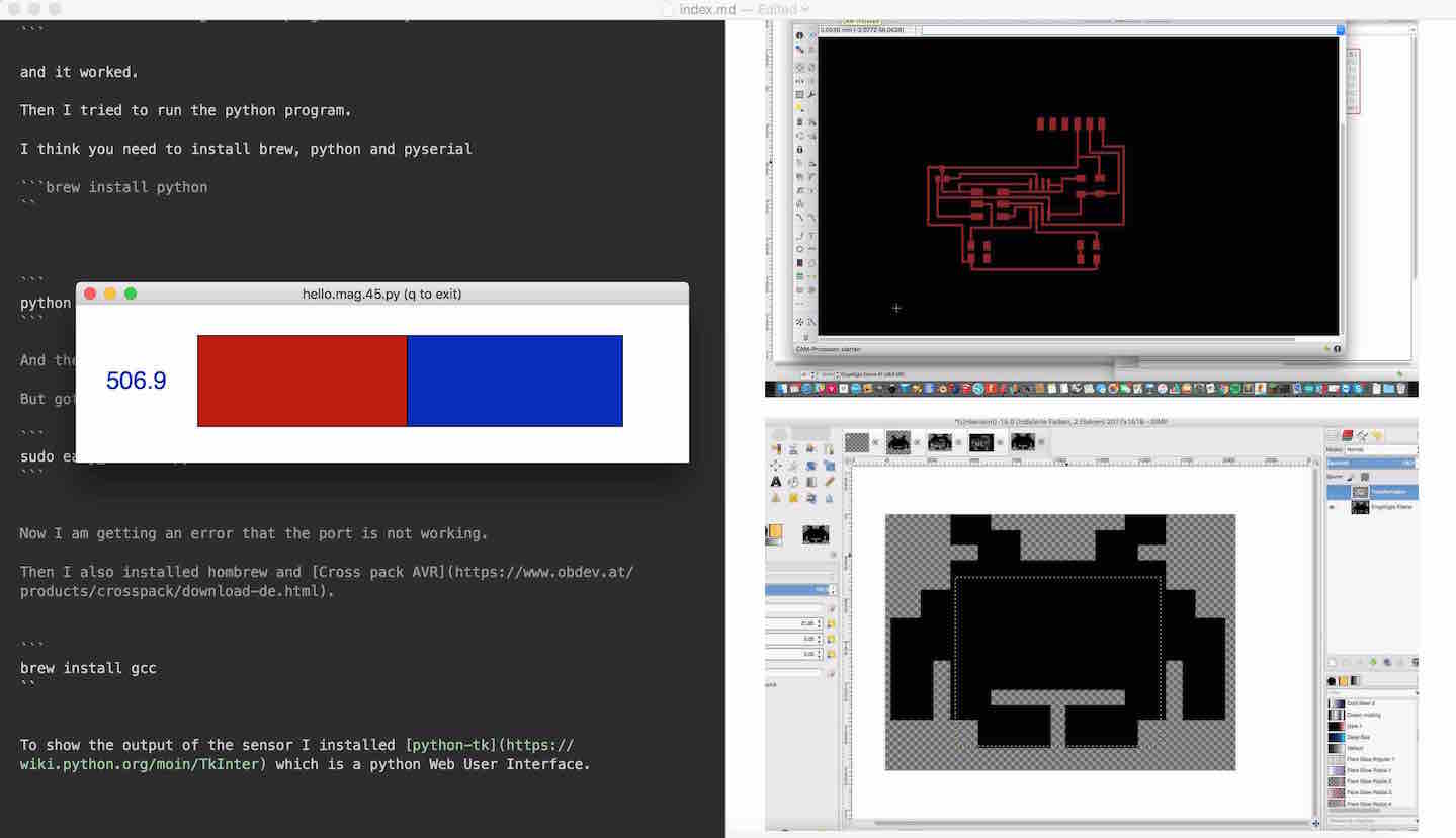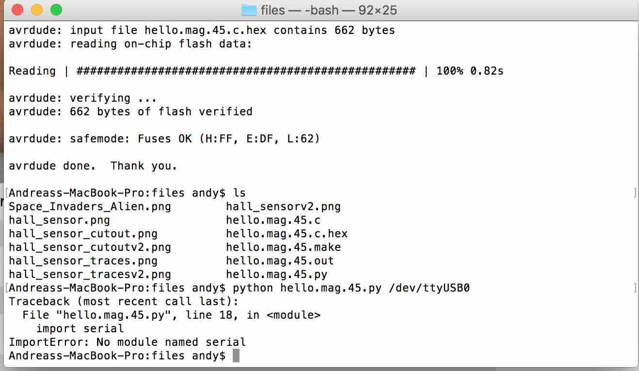python hello.mag.45.py /dev/tty.SLAB_USBtoUARTBut I got an error that the serial modul is not installed. So I installed it.