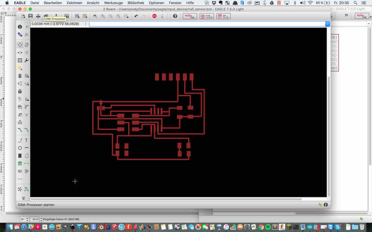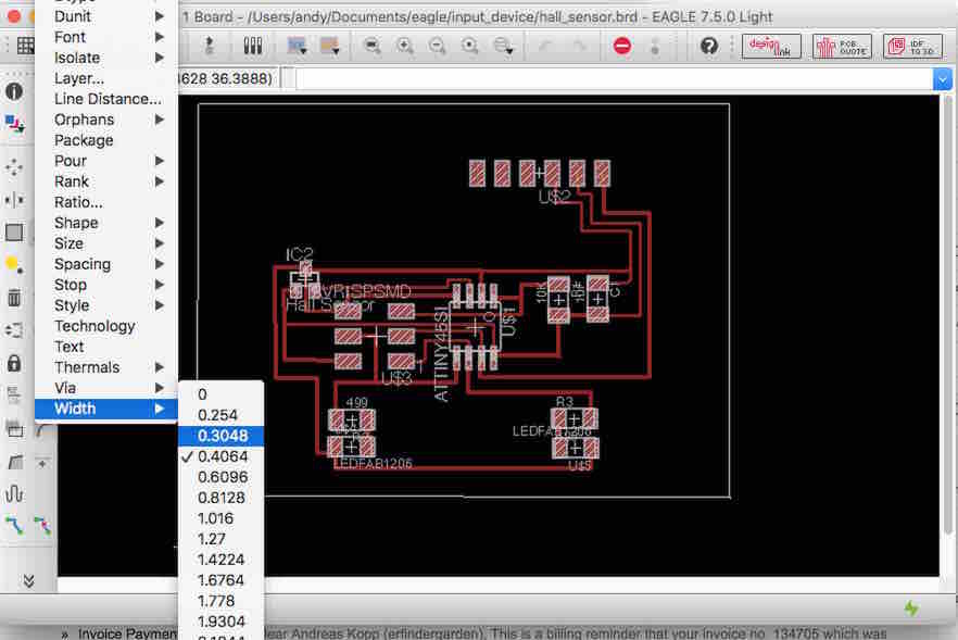To get the design through the Design Rules I had to make the traces smaller. Still I did not manage to go through the hall sensor with the ground but I will fix that later with my knife.