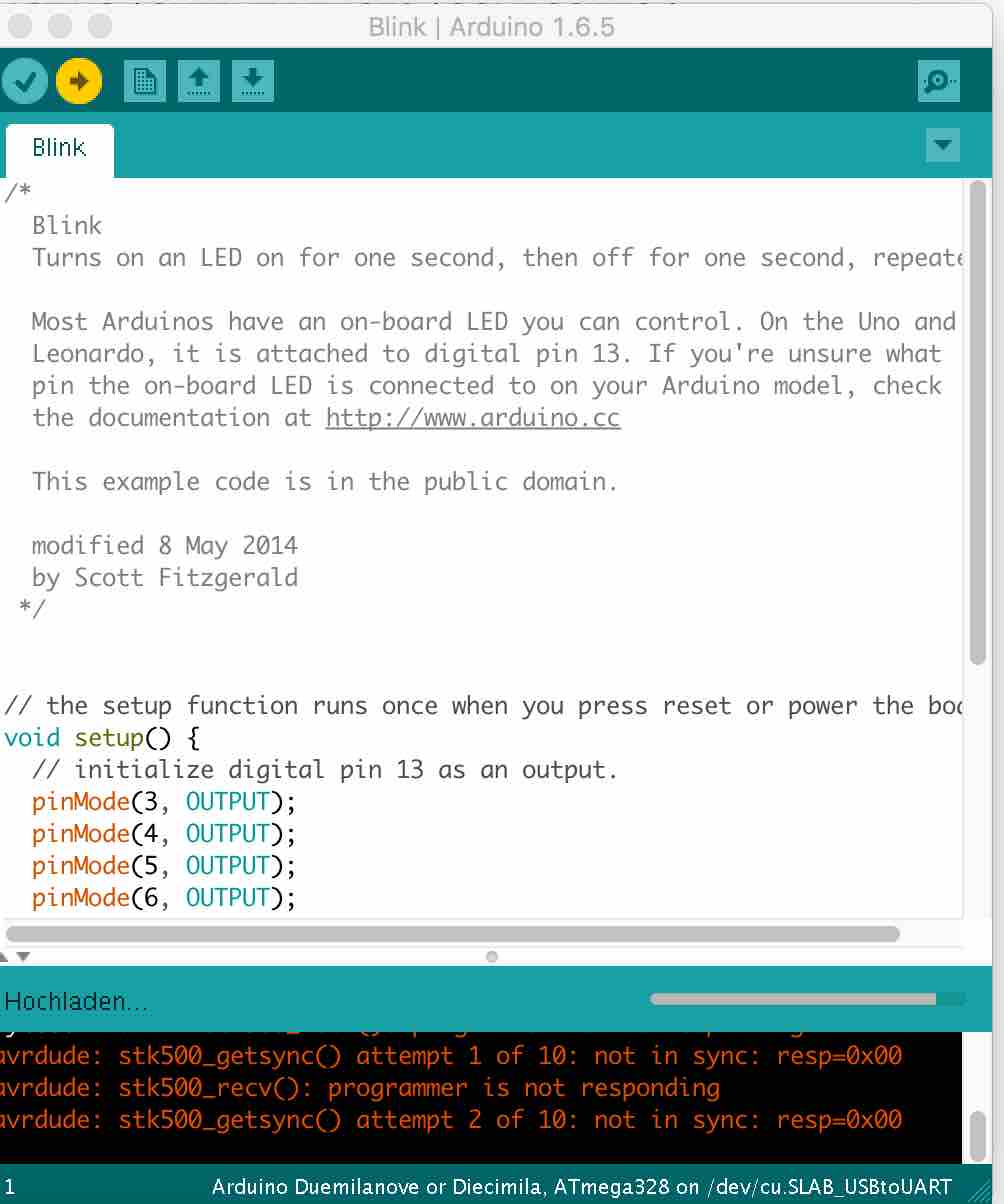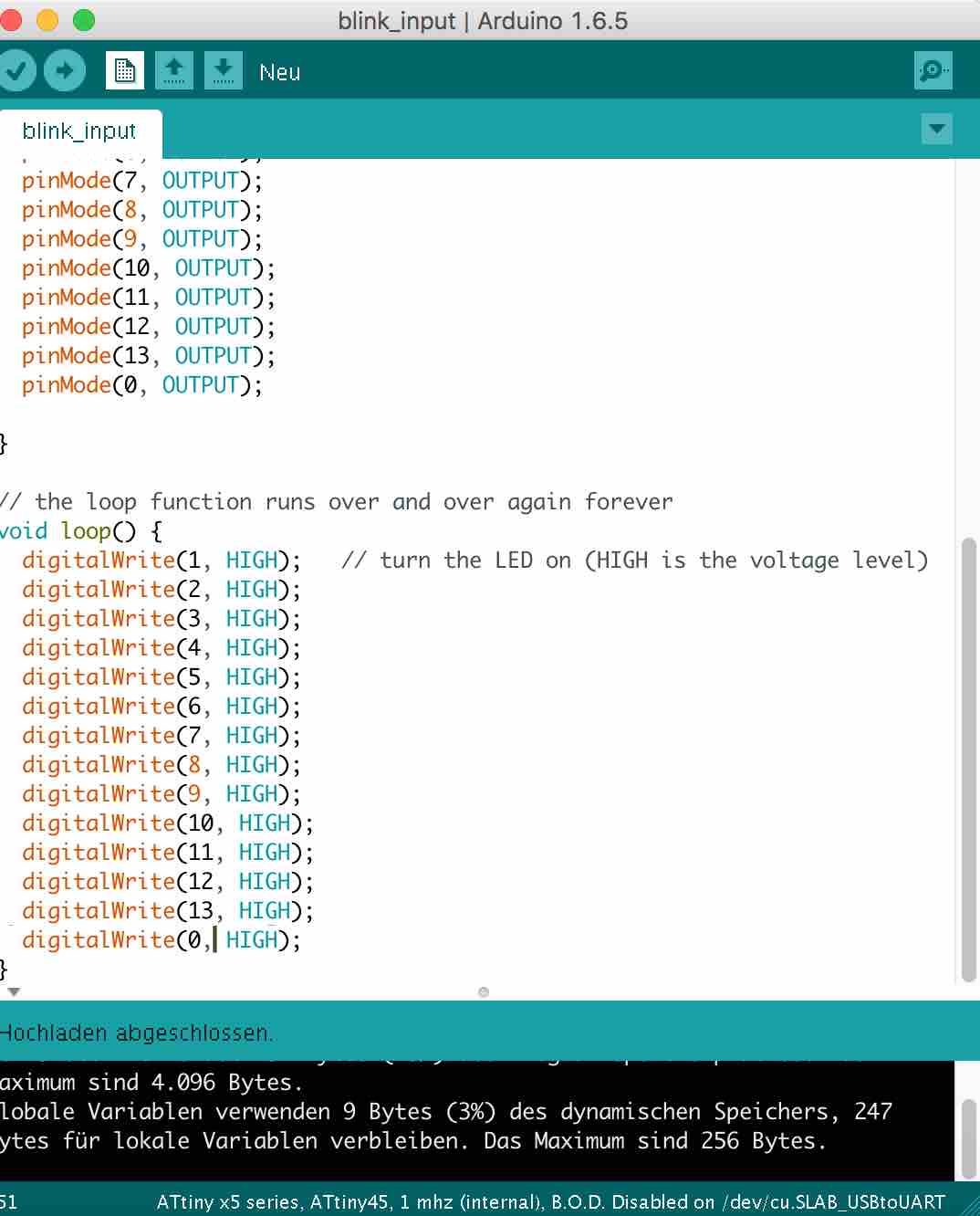 I opened the Ardunio IDE, chose Platine --> ATtiny x5 series, Chip --> Attin45, Clock --> 8Mhz internal (standard is 1mhZ), Port --> dev/cu.SLAB_USBtoUART and --> Programmer USBtinyISP.