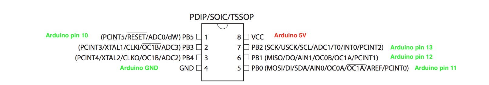 First I looked at the Attiny45 Datasheet to find out the pin Numbering and then also googled what would be the pins then in Arduino.