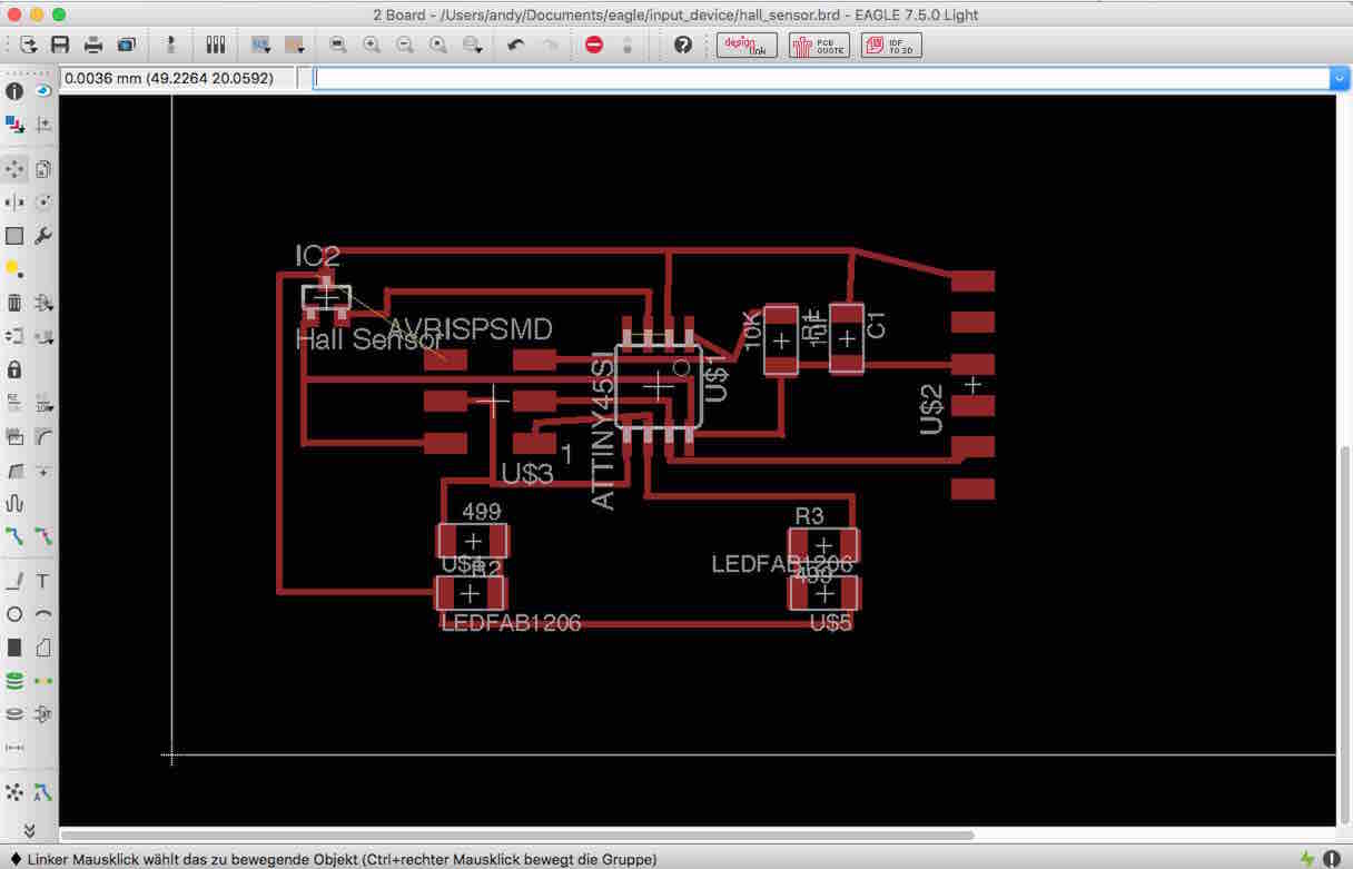 After like 15 iteration going back and forth between eagle and gimp making the traces smaller and splitting up the pads I finally got my final space invader hall sensor board Version1 at the end of the day.
