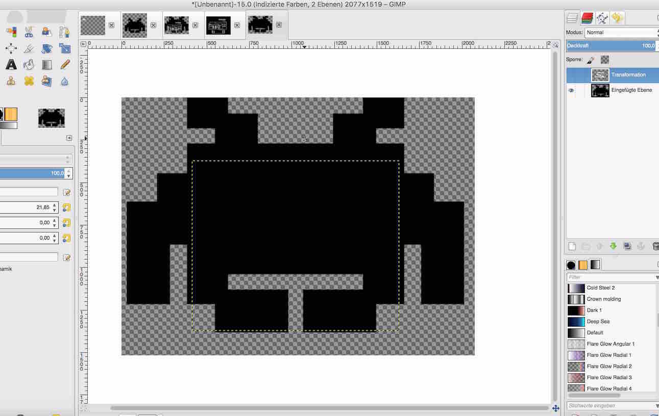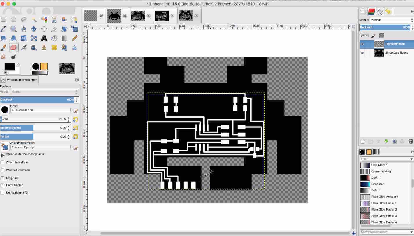 To make things a bit more fun I wanted to make a space invader design of my board. So I first drew a rough design with the eyes on top but I did not manage to connect all the components without using 0Ohm Resistors so I took Neils Design as a guideline and went from there. I also put the leds in the bottom. Then I did a first export and overlaid it with a space invader in gimp. I realized I need much more practice in gimp. I could not use photoshop because I do not have a license anymore.