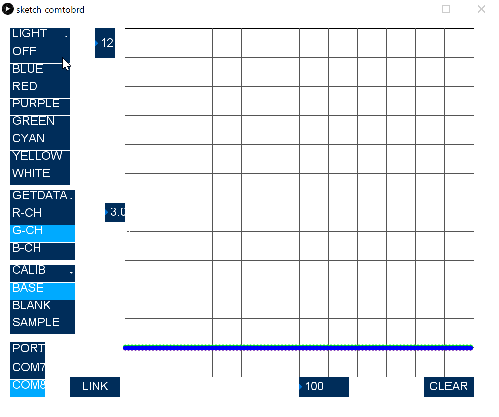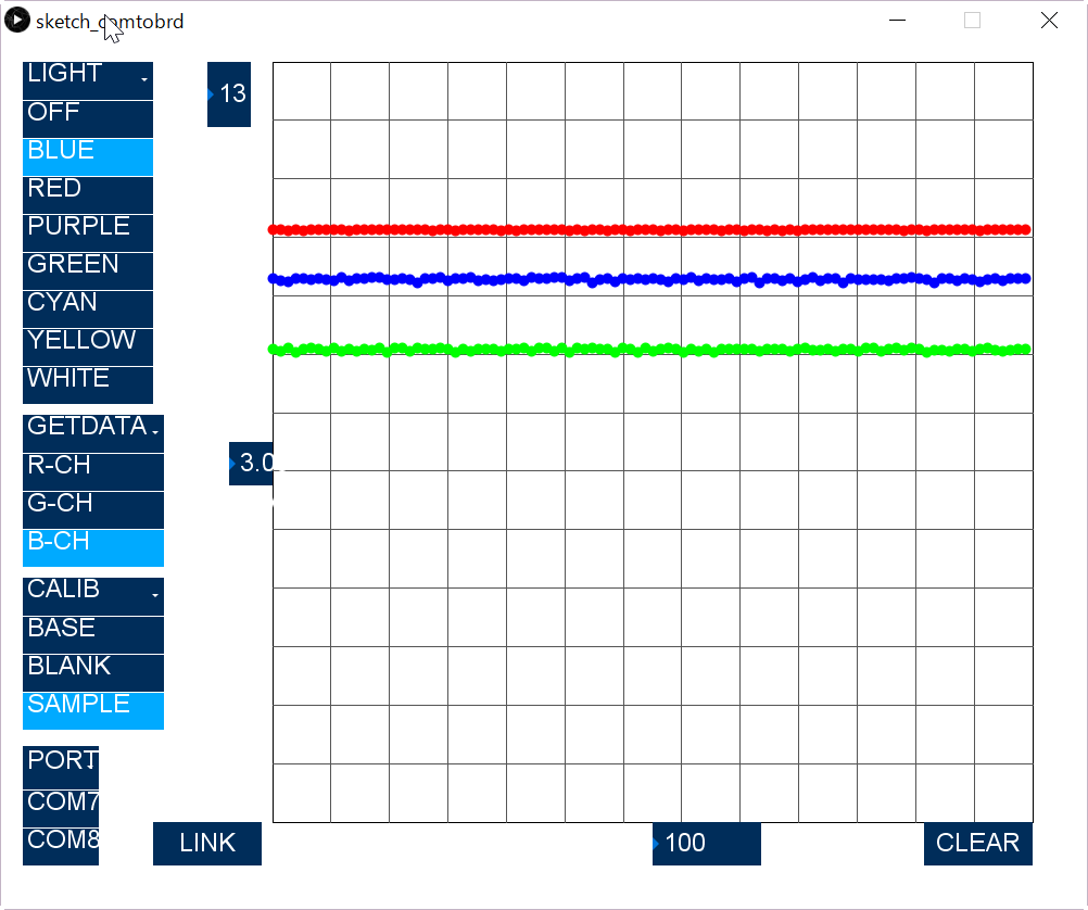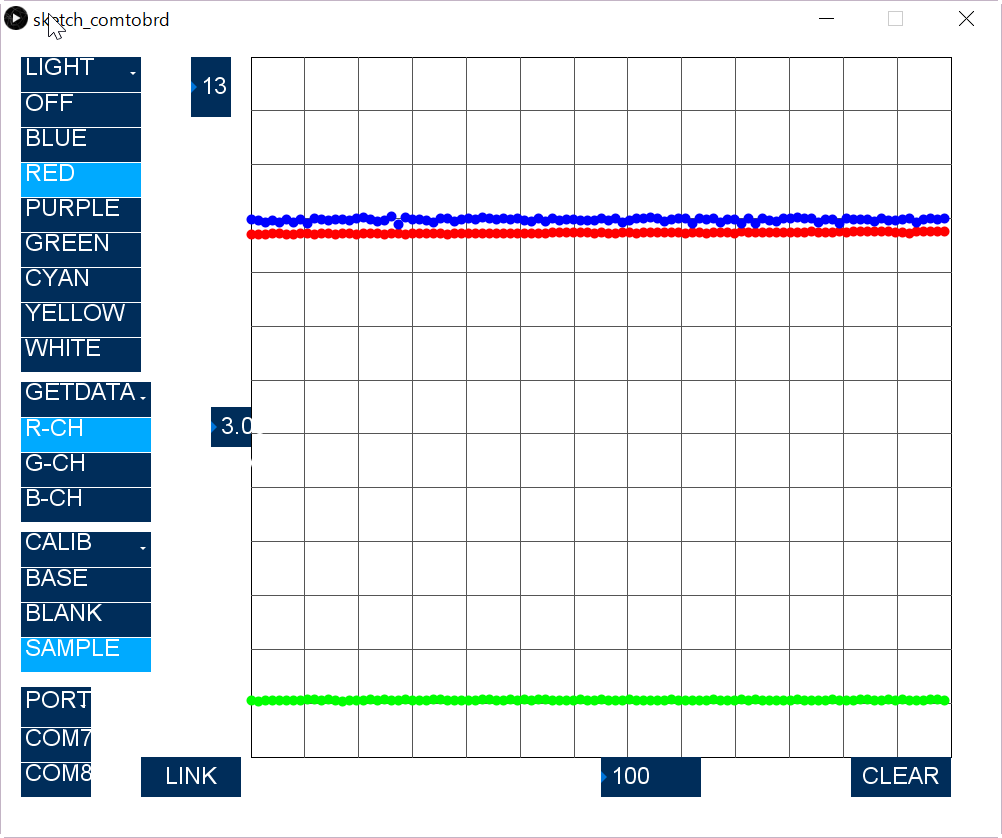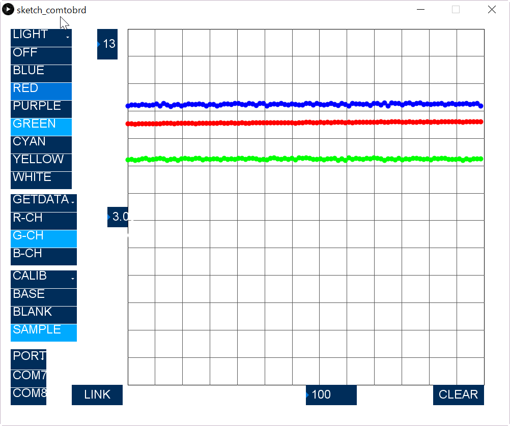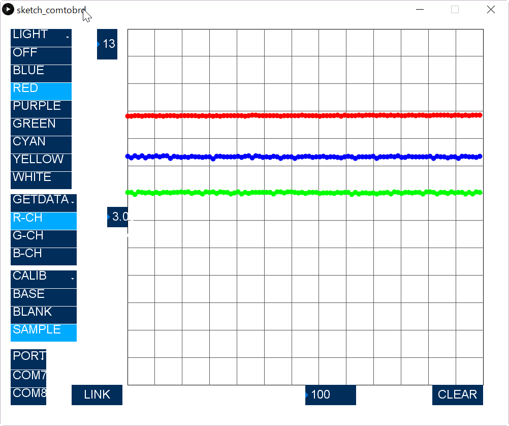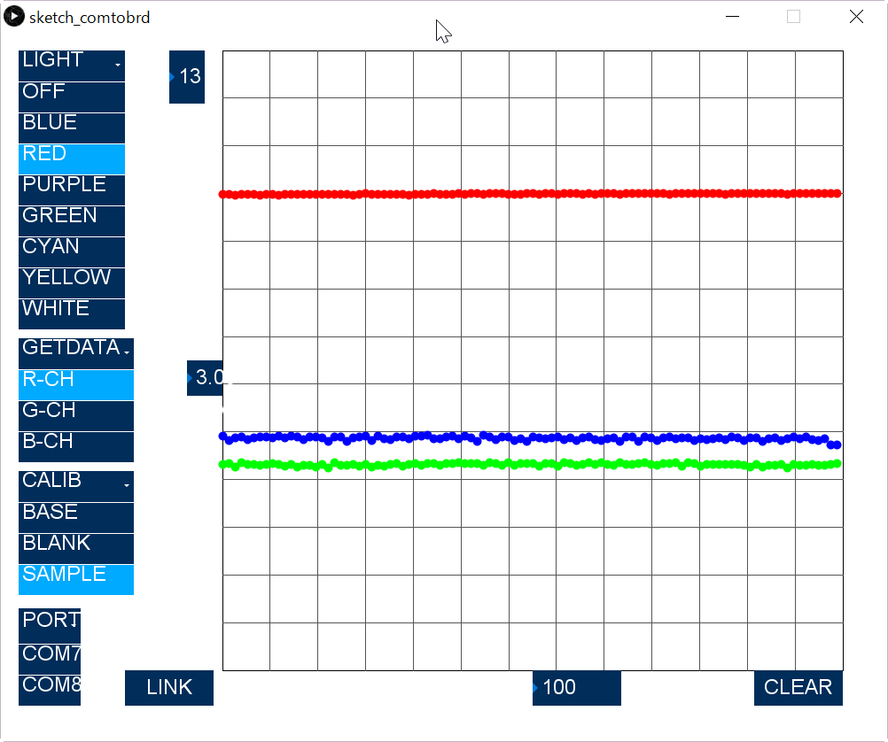 Subsequently, switch the CALIB "BLANK" to measure the no absorption case. Turn on "Blue" and get "B-CH" data. After that, do similar on "G-CH", and "R-CH". This data is memorized as maximum signal with out absorption.