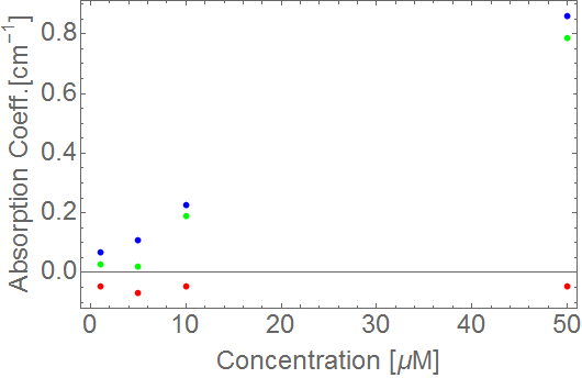 For above results, I can get the calibration curve as following. Blue and Green show linear and similar absorption coefficient. No absorption was obtained for red. It shows that the fabricated module works!!!