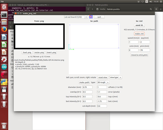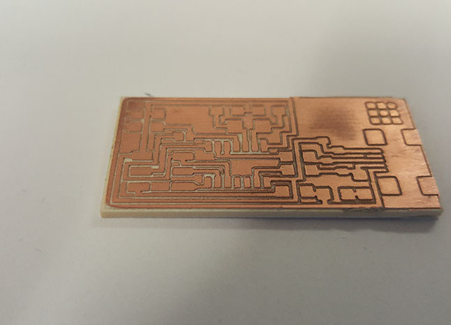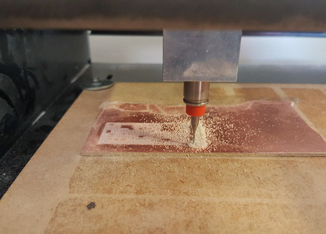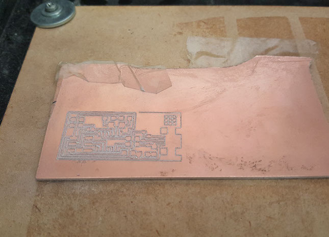 Now that i had my design it was time to get producing. Normally I'm quite fond of using etching as I feels it leaves a better finish, however it's due to it being a small circuit i decided to use our CNC milling machine for faster results. For the mill itself I used the FaB Modules. To do the paths I added a 1/64 V tool, for the parameters i only did 2 offsets because I don't quite like the finished product of many offsets and I'm quite sure of my soldering skills. As for the speed I used the defaults it had. For the cutout I used 1/32 mill, and kept all defaults except for the depth of cut which i made slightly bigger.