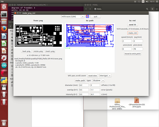 First I did the milling with an end mill tool of 0.2 mm diameter, with 2 offsets and a depth of .1 mm