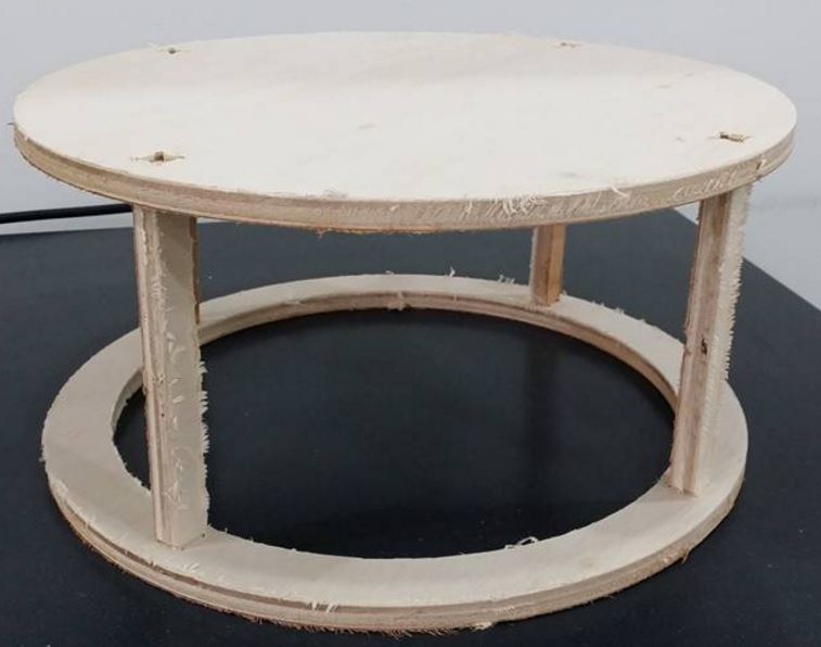 I designed the necessary parts to construct the design mentioned above in inkscape. . The design consist of 2 parts, a flat top where the turn table will be placed, and a hollowed out body to contain the basketball. I designed with the largest basket ball in mind, which is 250mm in diameter, and added 40mm to the radius for the ball to move freely. The joints is a simple slot in joint, the hole is designed using the dogbone shape as per depict in the following screenshot. My coursemates have reported the perfect size for a good it for slots to be 11.5mm. I have designed my challenge chair using the parameters reported. . From inkscape, one can export the file into standard such as dxf. My design in svg can be downloaded from here My design dxf can be downloaded from here