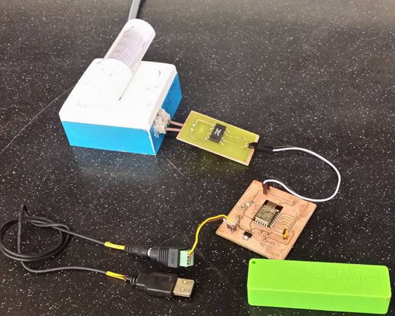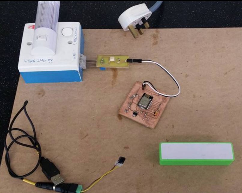 This week’s Assignment is to use the board we have designed, and stuffed, to control output devices. Output devices ranging from RGB LEDs, WS2812 aka NeoPixels, Servo, DC motors, Relays and such. Yours truly is no stranger to controlling stuff with MCU. Back in 2014, he has modified a standard UK multiplug and stuffed it with a store bought (read: sparkfun) Solid State Relay (SSR) board, such that a MCU able to control AC with it. More details at his instructables here. With this contraption, yours truly then controlled an lamp running on AC over the Internet; instructables is available here
