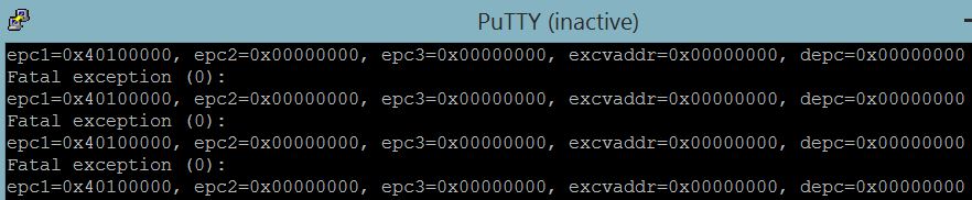 First, I revert into boot mode, hopefully to be able to observe ready via putty on a baud rate of 115200. Instead, the blue LED on ESP8266 ESP12-E is constantly BLUE, and I observed the following on putty via baudrate 76800. I shall call this case1