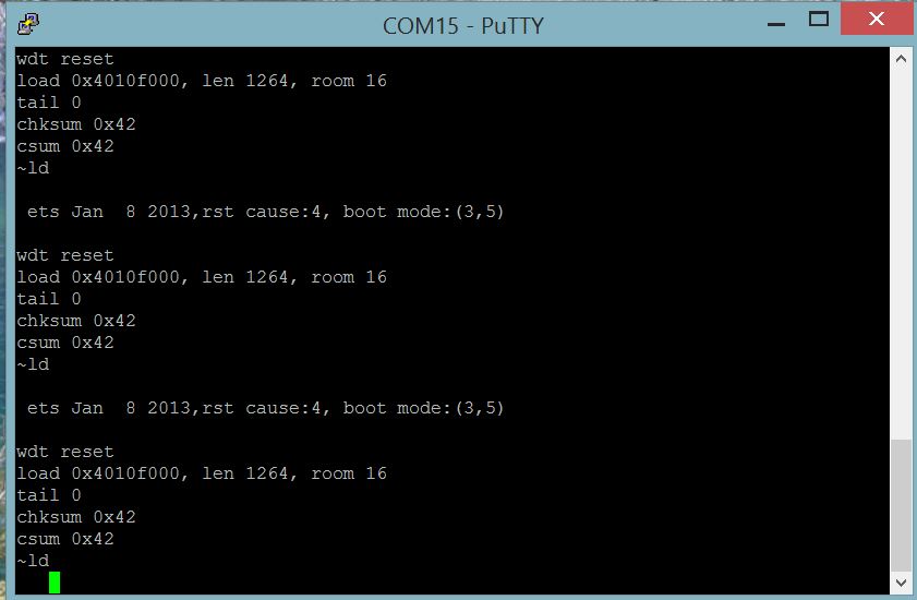 After that, jumpers are set to boot mode, and I observed the following on putty 115200 baud, GPIO(0/2/15) as 3V3/3V3/GND