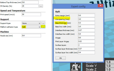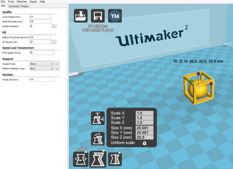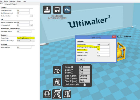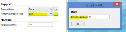 Cura have more option for support type and platform adhesion type. For support type, we can choose none, touching buildplate and everywhere. On top of that we still can choose overhang angle for support, amount it fill etc. For this file i print, I choose none for support, because my object is small so that support will be hard to remove after that and such a small object using support or not not really matters. For Platform adhesion type I choose Brim, the reason I choose Brim is easy to remove and my object is small so that I want to have more area touching buildplate. For expert config for Brim, we only can choose how much brim line. I choose 20 for my object. However there are more option for raft such as line space, base thickness, surface layer etc.