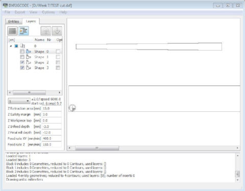 The correct endmill is selected from the Layers tab. This is also where you set the milling parameters for the CNC. Once this setup is done, you can generate the correspondig gcode by selecting Export > Optimize and Export Shapes. The generated gcode is then loaded into the CNC_CHANGE (JG) program for our Signvec CNC router.