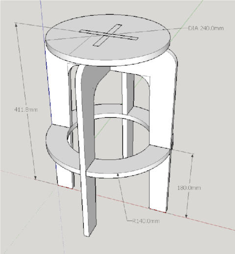Once the choice of software had been decided, I proceeded to design my stool. I first made a 3D model and assembled it in SketchUp, to make sure that all the parts would fit. From here, I made a copy of my model, broke up the copy into its component parts, e.g. seat, legs, and laid them flat on another part of the workspace, ready for export to dxf.