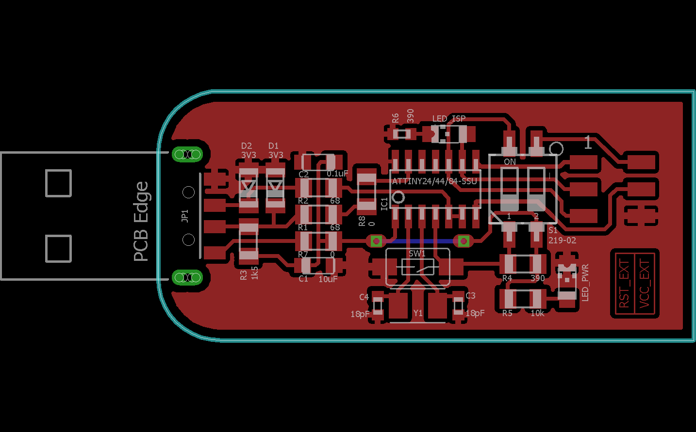 Moreover, I wanted to improve the GF_FabISP Design, to have a couple leds and a DIP Switch to enable and disable the traces that were previously controlled by the 0 Ohm resistor (or the solder bridge on the original FabISP design). That because in my opinion is a more quick and versatile way to reprogram the board if needed, than resoldering and desoldering once again the solder bridge.