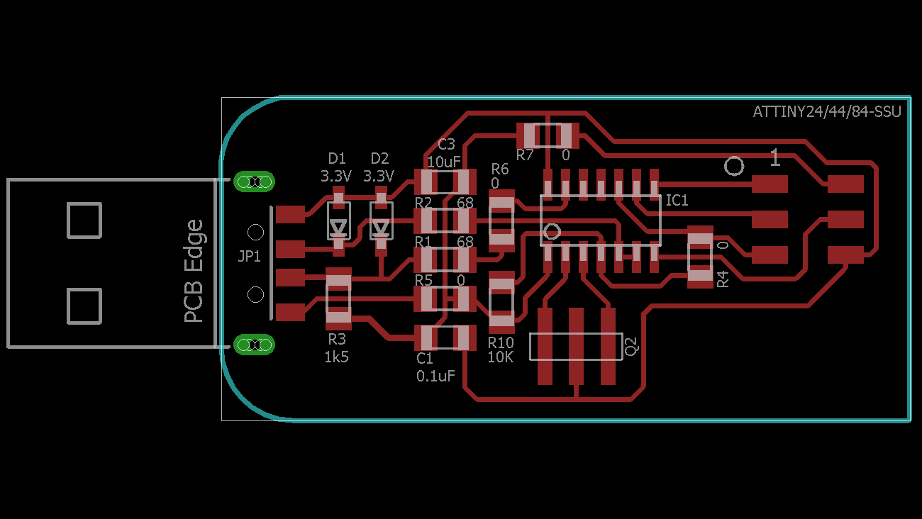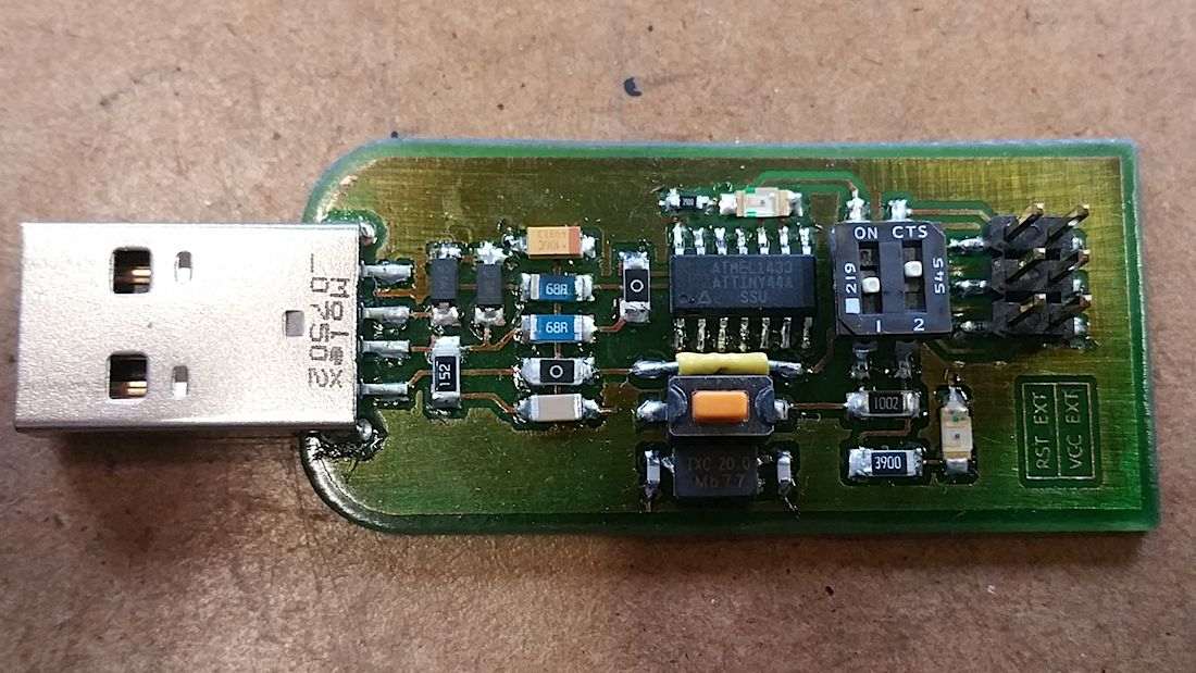 My version is not so different from the original, but I substituted the Mini USB port with a full size one, to avoid the usage of a USB cable, and a 20MHz resonator. I didn't want to use the PCB version of the USB connector (as seen in Andy's version), because of the problems people had about the thickness of the board, leading to a not tight fit inside the PC port.