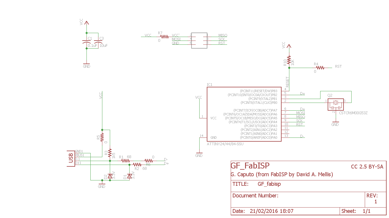 Our FabLab instructor provided us with a modified version of the FabISP created by David Mellis. After looking at the schematic and the board layout I decided to use it as base, to create my version of the FabISP.