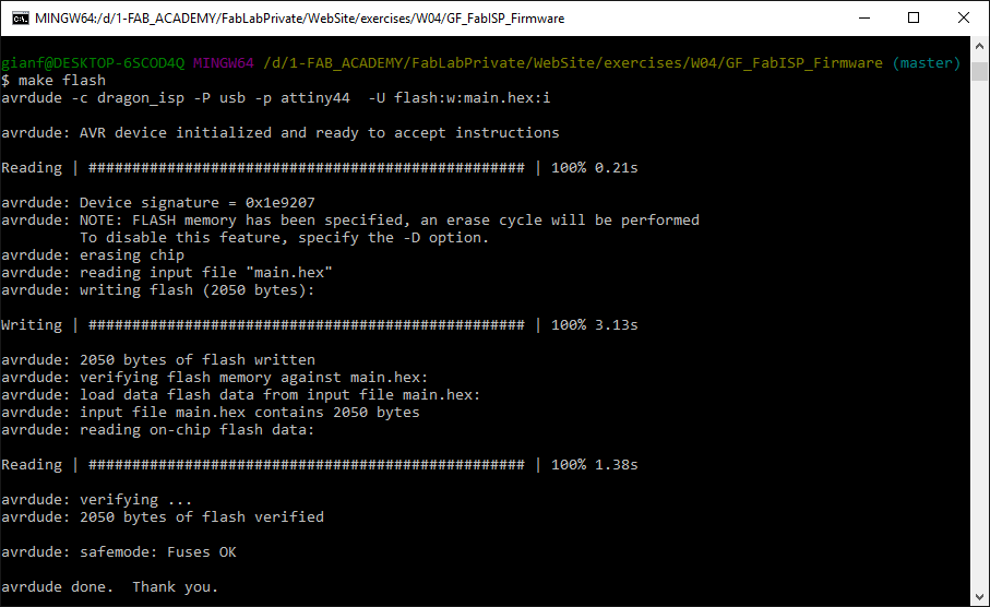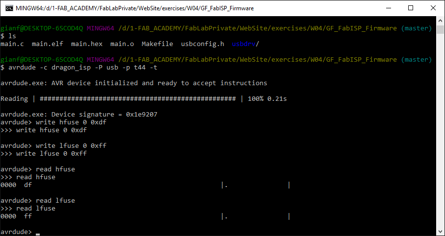 Having installed correctly the AVR Dragon, I checked with AvrDude if my GF_FabIsp was recognized, using this command. Note that the parameter '-t' starts AvrDude in terminal mode.