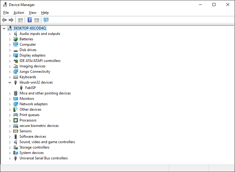 Everything went smooth, so I unplugged my GF_FabIsp and the AVR Dragon, and re-plugged the GF_FabIsp after desoldering the R4 0 Ohm resistor. The device was recognized correctly by Windows, as shown in Device Manager from the image below.