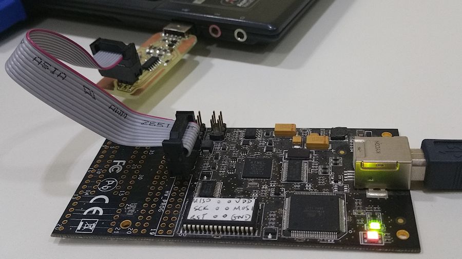 In order to program my board I needed another programmer, but since I've been working with Atmel and AVR microcontrollers for a long time, I had the AVR Dragon in my drawer, ready to be used!