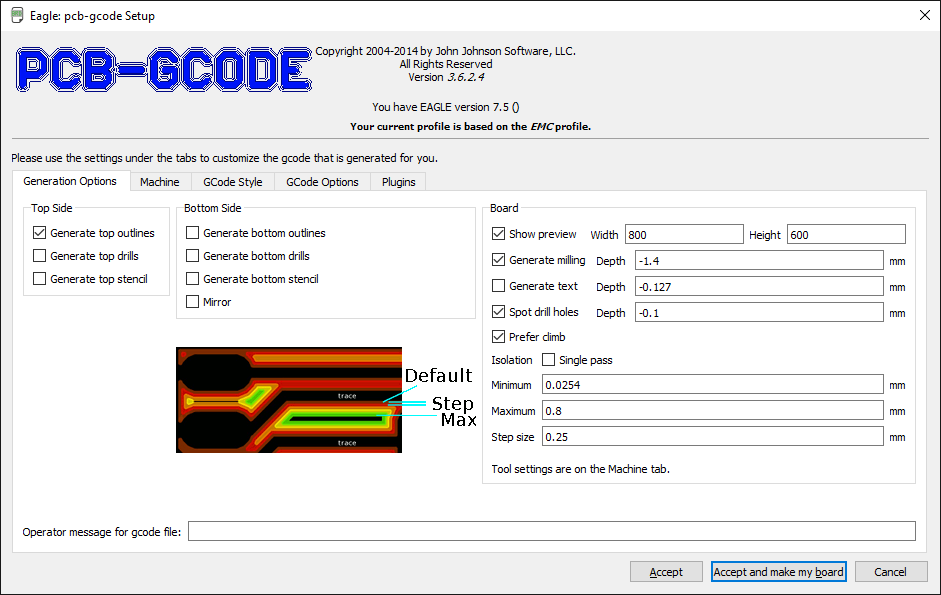 We used a 0.4 mm burin, so we entered in the plugin form the parameters shown in the images below, with a Z depth of -0.05mm. Moreover below you can see the generated path for etching and outline milling.