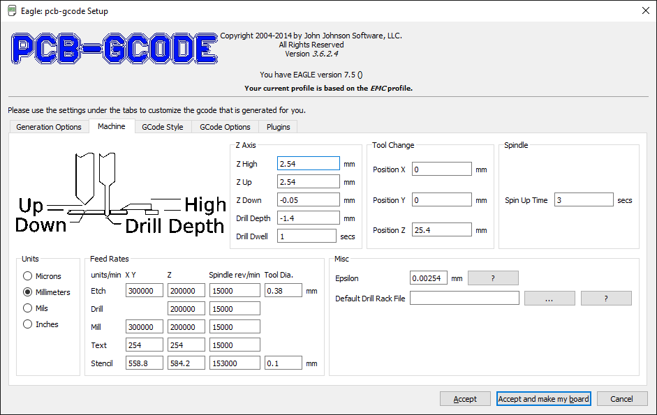 In order to produce the board with the mill, a Roland Modela MDX-40, we used a plugin form Eagle Cad, called pcbgcode. This plugin, generates G-Code from the layout of the board, so that the mill can etch the board.
